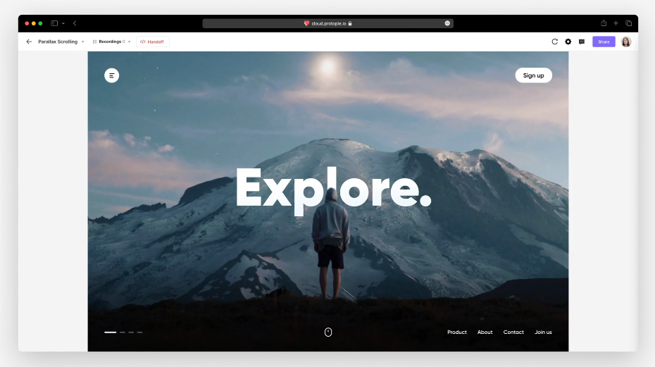 Utilize ProtoPie Cloud, a web-based platform to store, manage, handoff, and share your prototypes from anywhere on any device.