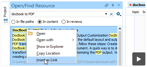 When using the Open/Find Resources dialog box or side view, you can now right-click a result and select the Insert as Link contextual action to quickly add a relative link to that resource at your cursor position in the current document.