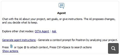 A useful welcome screen is displayed before you start a chat with the AI. It contains general instructional information and links to quickly change the chat mode (Ask, Agent, or DITA Agent). There is also a Show actions link that you can use to see the list of all available predefined AI actions.