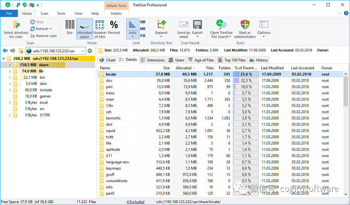 The SSH protocol can be used in the new released version to access Linux or Unix servers. This enables a system-wide and uniform reporting and management of storage space with TreeSize.