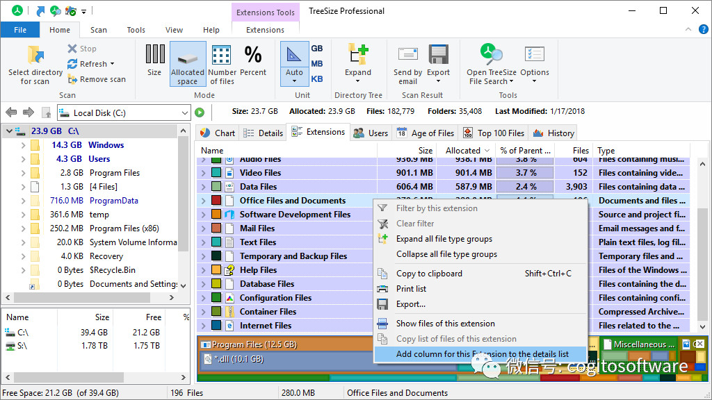 Using the context menu in the corresponding tabs in the main module, you can display file types and intervals of statistics about the file age in the "Details" list as columns. They can also be included in reports in Excel, PDF, HTML or text format. In this way, individual file types or age categories can be easily tracked across the entire directory hierarchy.