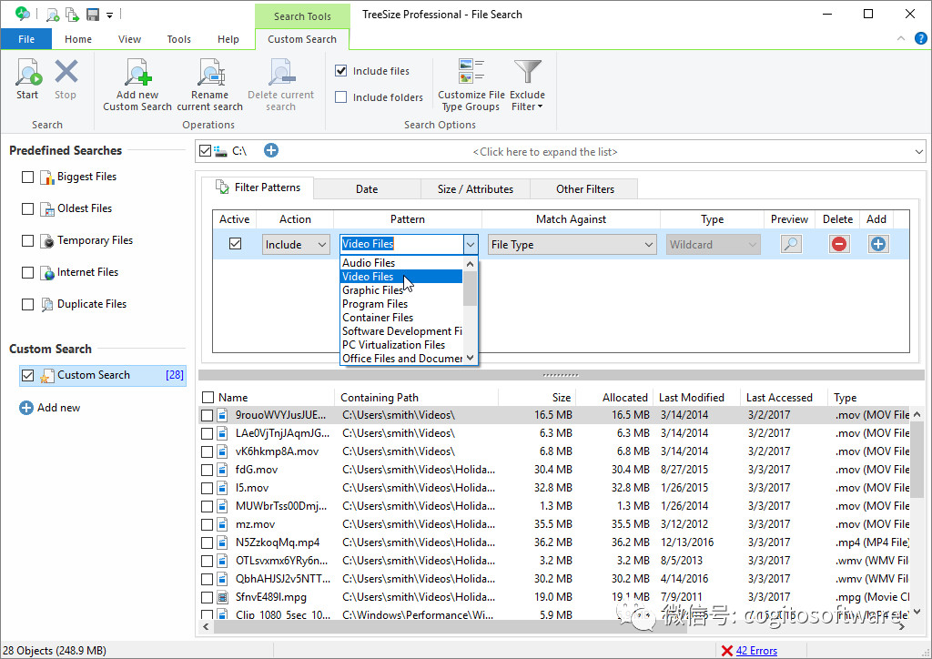 You can use the existing file type groups such as "Video Files" or "Office Files" as search criteria in the file search. These groups can now be edited in the file search settings.