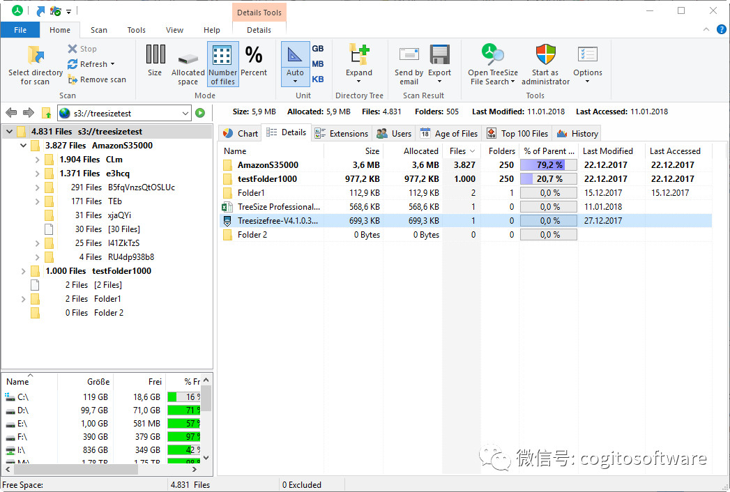 TreeSize version 7 now provides access to your data stored in the Amazon S3 cloud object store, lets you scan it and search for specific files. In this way you can easily save costs, as every GB is finally accounted for here.