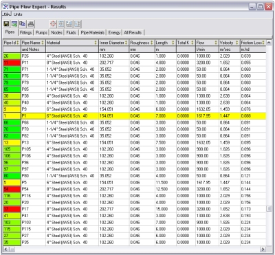 When the user wants to see the calculation results in a tabulated list, the PipeFlow Expert results can be viewed on the Results Grid in spreadsheet format. The Results Grid and the Pipe System Drawing are interactive and clicking on an element in one of these causes the same element to be highlighted on the other. This makes it very easy to analyse individual items and problem areas within a piping design. The software provides an easy 'select and zoom to' capability that allows selection of a row on the Results Grid and instant 'Zoom to' functionality, which displays and shows the selected item in the centre of the pipe system drawing.