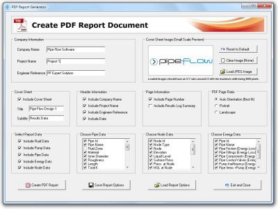 Pipe Flow Expert can generate a professional customized PDF report that documents your pipe system design. With just a few mouse clicks the user can choose to include your company logo on the report cover sheet, select which types of pipe system data to generate, and select individual pipe results data to display in tables.