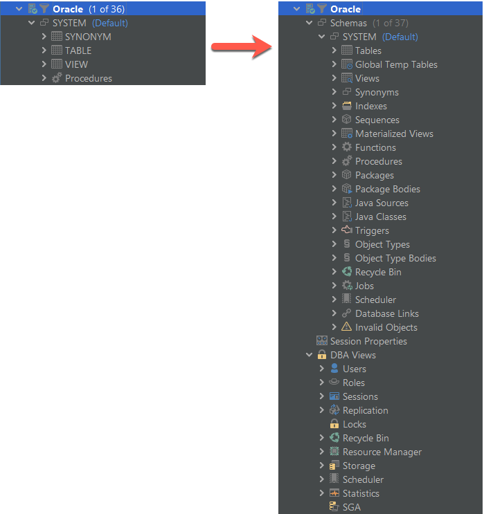 The following sample is for Oracle showing how it used to look (left) and with the change in the new version (right).