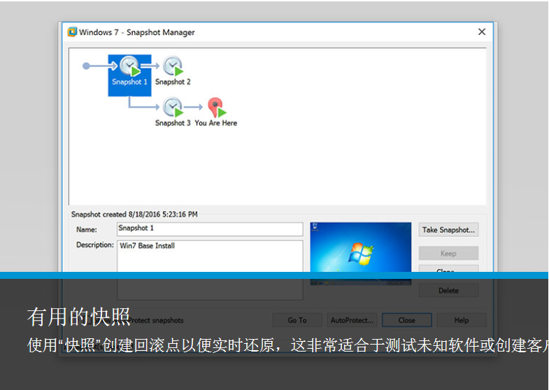 Use Snapshots to create a rollback point to revert to on the fly, which is perfect for testing unknown software or creating customer demos. Multiple snapshots makes it easy to test a variety of different scenarios without needing to install multiple operating systems.