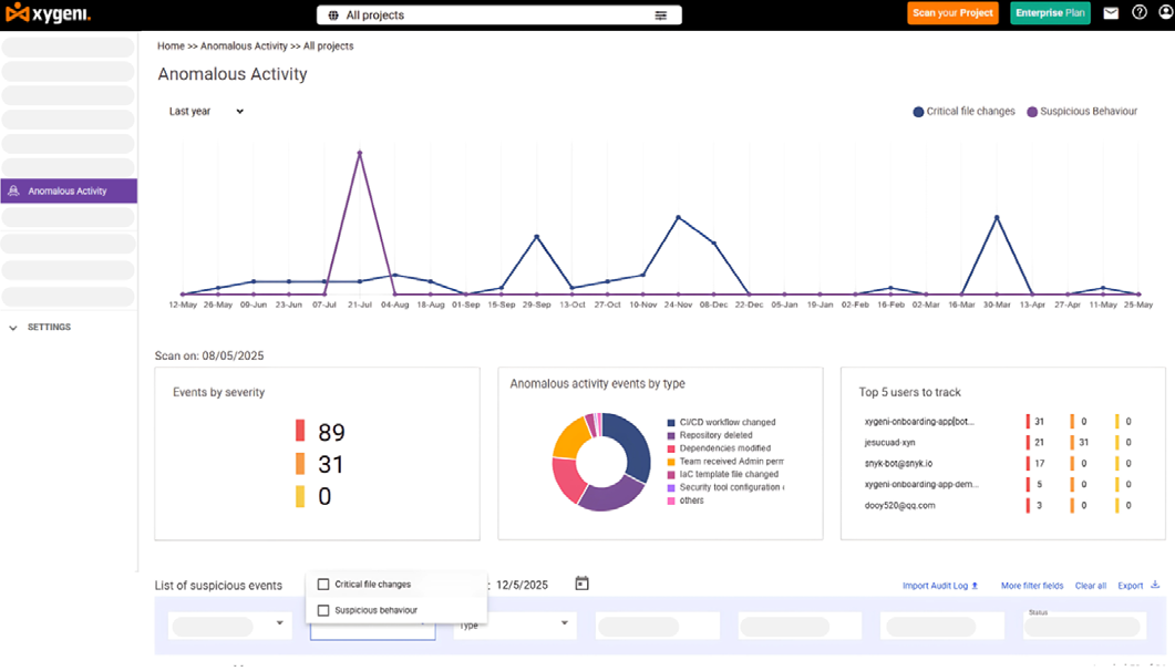 Xygeni monitors activity on code repositories and other tools to detect potential attacks,such as deactivating security measures,attempting to execute risky actions or skipping corporate security policies.As a result,customers of Xygeni receive alerts when a security issue may impact them.