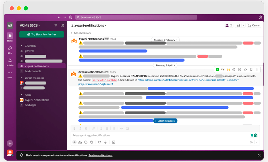 Xygeni ensures proactive security by providing real-time alerts for detected anomalies, allowing your team to respond quickly to potential threats. Alerts can be sent directly via email, a webhook, or integrated into messaging platforms like Slack, ensuring that your teams receive immediate notifications. This rapid alerting system is equipped to deliver crucial context about each incident, enabling a quick and informed response to protect your operations.
