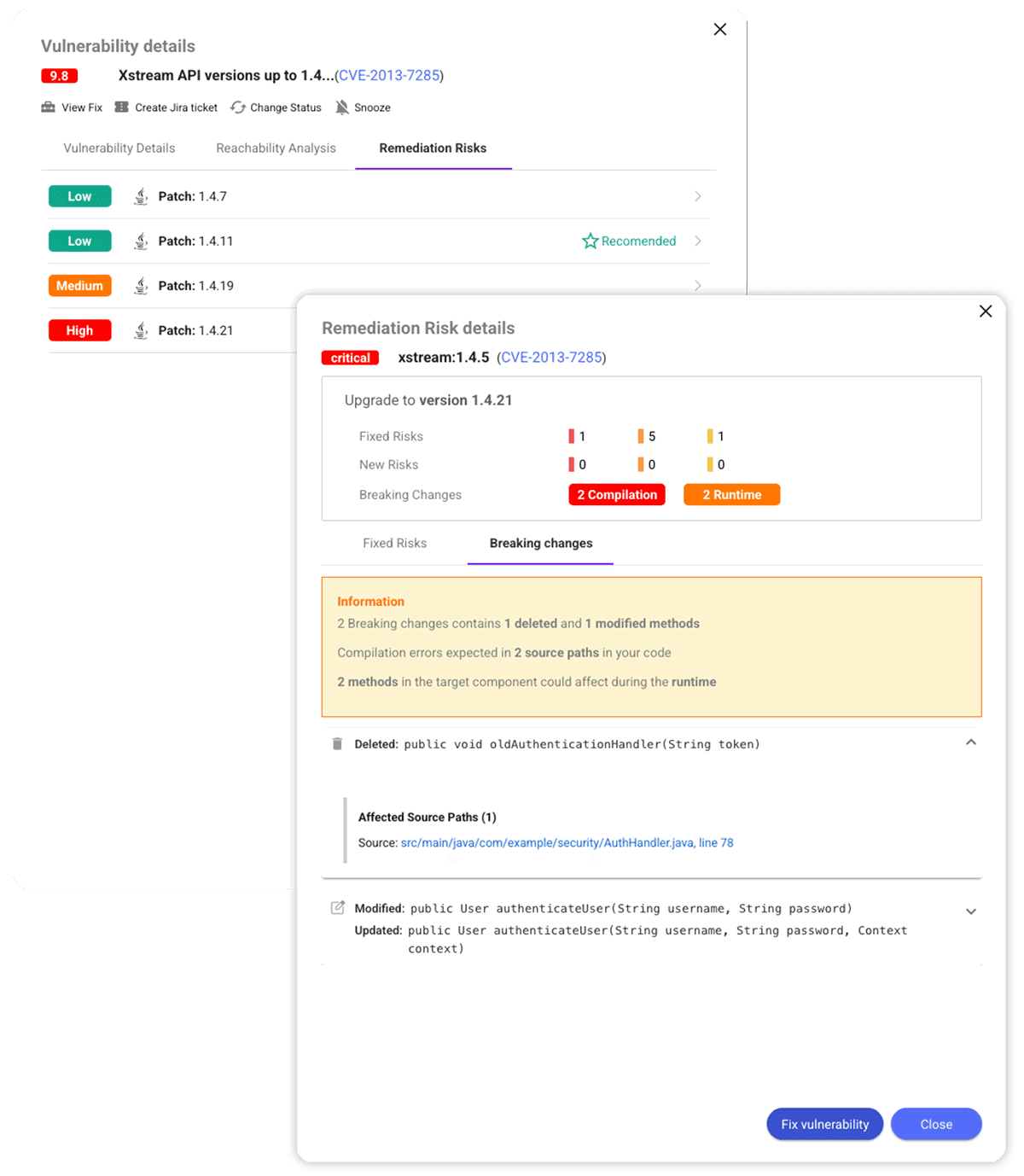 Automatically upgrade to vulnerable-free open source dependencies, either through automatic fix pull requests or manual prompts. It saves significant time and resources, ensuring prompt and consistent vulnerability management.