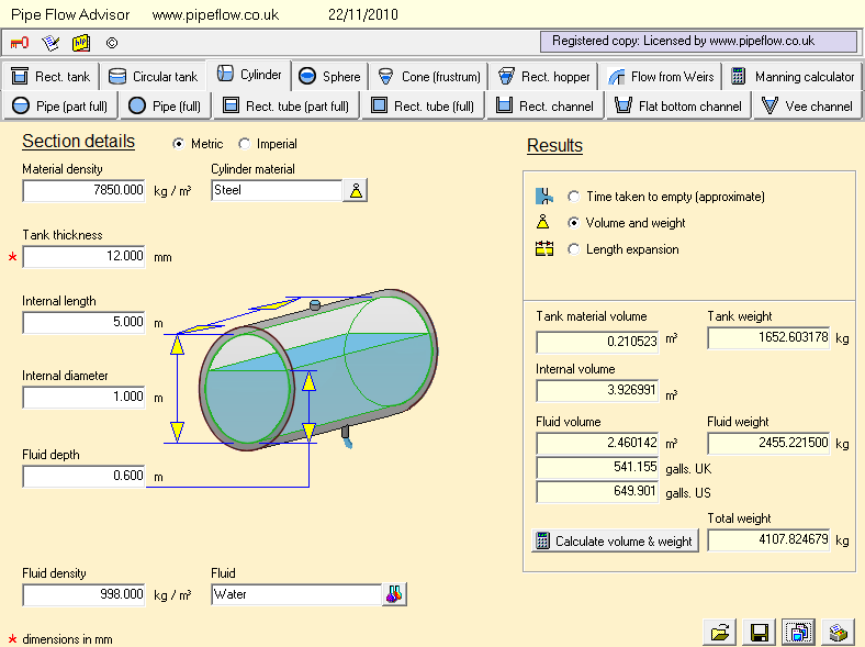 Pipe Flow Advisor can calculate tank weight, tank capacity, tank expansion due to temperature change and used volume for a given height of fluid.