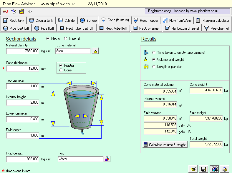 Pipe Flow Advisor has a different volume calculation screen for each different style of tank. For example the screenshot shown here shows the calculation of properties for a cone shaped tank.