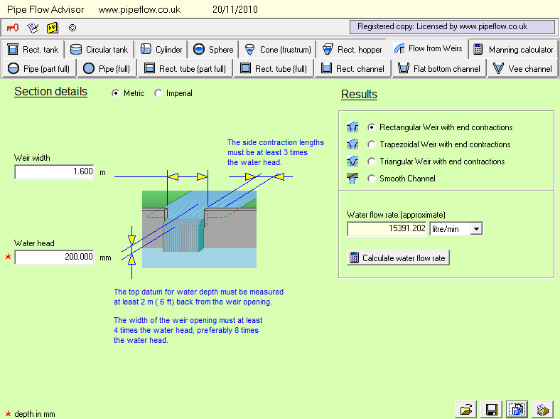 Pipe Flow Advisor can perform four different calculations, using the dimensions of the weir, the weir's water head (raised to a specific power, dependent on the design of weir), and a constant factor (also related to the specific design of weir under consideration).