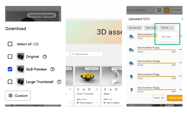 With our 360° spin Generator feature, you can create interactive 360° spins directly in KeyShot DAM without third-party tools. Simply drag and drop individual frames of the product into the platform, follow a few steps, and the spin is generated, enabling zoom, rotation, and multiple angle views. Transforming 2D images to immersive product visuals for your online stores has never been easier.