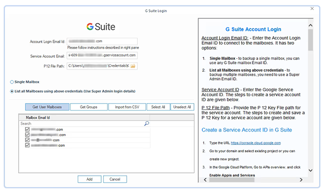 Step 1: Launch the G Suite backup tool and click on +Add to add G Suite mailboxes.