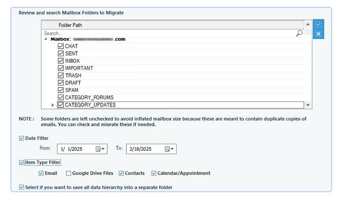 With the Filter feature, backup selective data from a large-sized mailbox with ease. Choose from various filter options, such as date range, data types, and skip previously migrated emails for email backup.