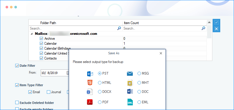Choose the format of your choice out of multiple output options, including PST, MSG, MHT, HTML, DOC, DOCX, PDF, EML, and more. The O365 PST export process involves 4 simple steps: Select Source, Apply Filters, Select Destination, and Migrate.