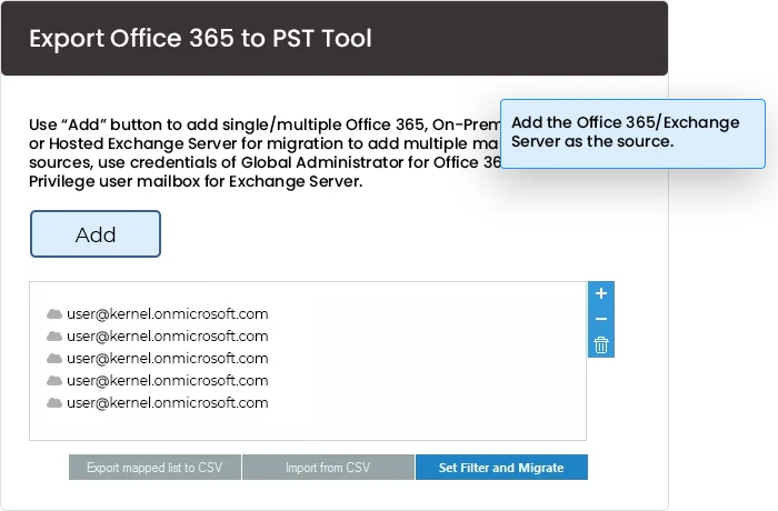 The Office 365 Export Mailbox to PST tool uses a CSV file to streamline the process. Create a CSV file with source and destination to export multiple Office 365/Exchange Server mailboxes automatically. This time-saving feature enhances productivity.