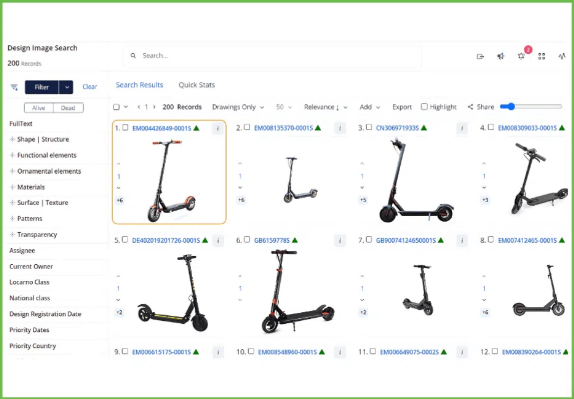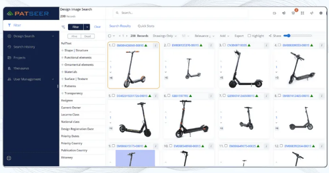 1. AI-Powered Image Similarity Search: PatSeer allows you to upload any design image as your query and returns fast and accurate visual matches.